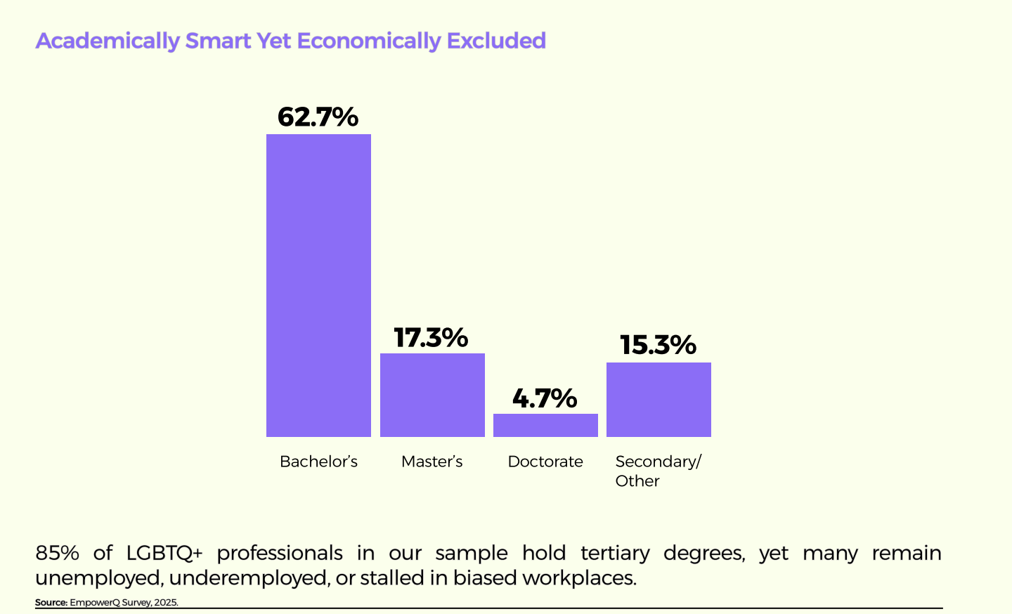 National graduate unemployment is 22 percent. Among queer graduates in our dataset, it rises to 26 percent, despite strong academic and technical qualifications. Employers often rely on terms like “cultural fit,” “values,” or “professional appearance,” which function as coded ways to exclude queer applicants who do not conform to rigid expectations.