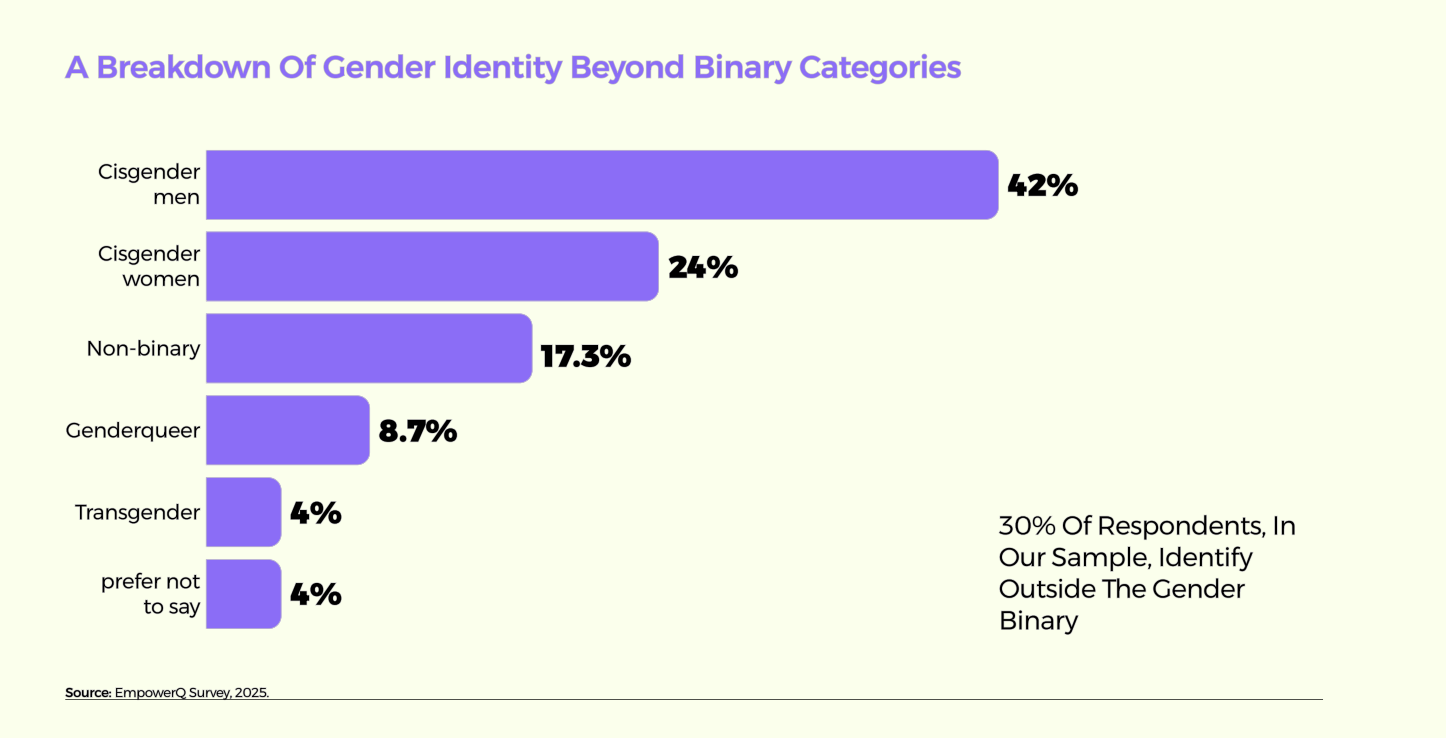 42 percent of respondents identified as cisgender men, 24 percent as cisgender women, and 30 percent outside the binary. In a country where most forms still assume two genders, this dataset offers one of the few accurate pictures of gender diversity in Nigerian workplaces. Another 4 percent declined to disclose.