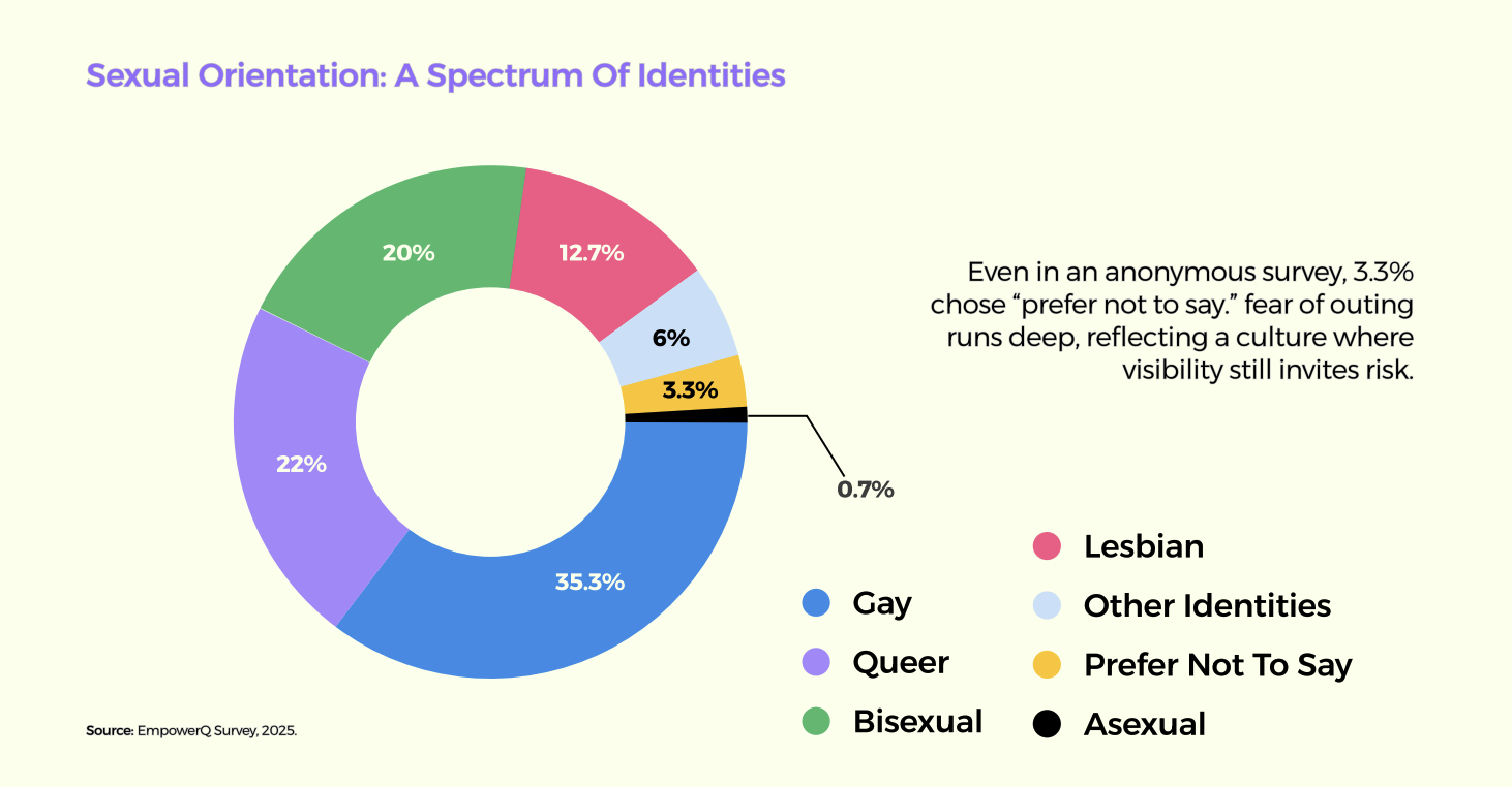 Respondents were overwhelmingly young: 85 percent were under 35, 12 percent were aged 35–44, and only 2.7 percent were aged 45 or older. The steep drop after 35 hints at the pressures that may push older queer professionals into silence, informal work, or migration.